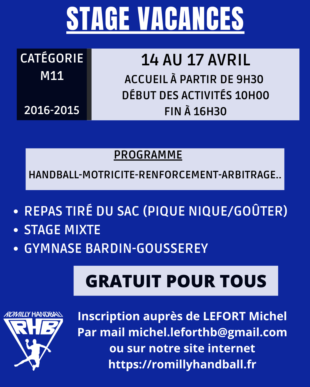 Les vacances arrivent et notre stage vacances fait son retour ! Si vous souhaitez inscrire votre enfant au stage du RHB